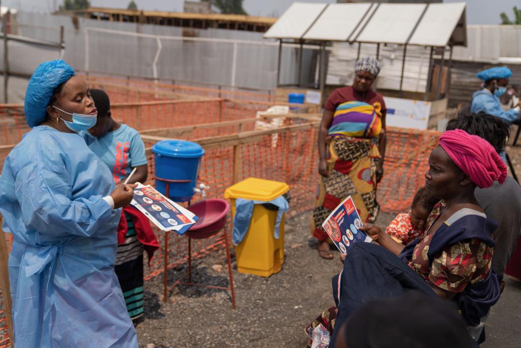 2024年8月19日,在刚果(金)北基伍省首府戈马市郊一家医院,一名医务人员为人们讲解猴痘病毒感染预防知识。新华社发