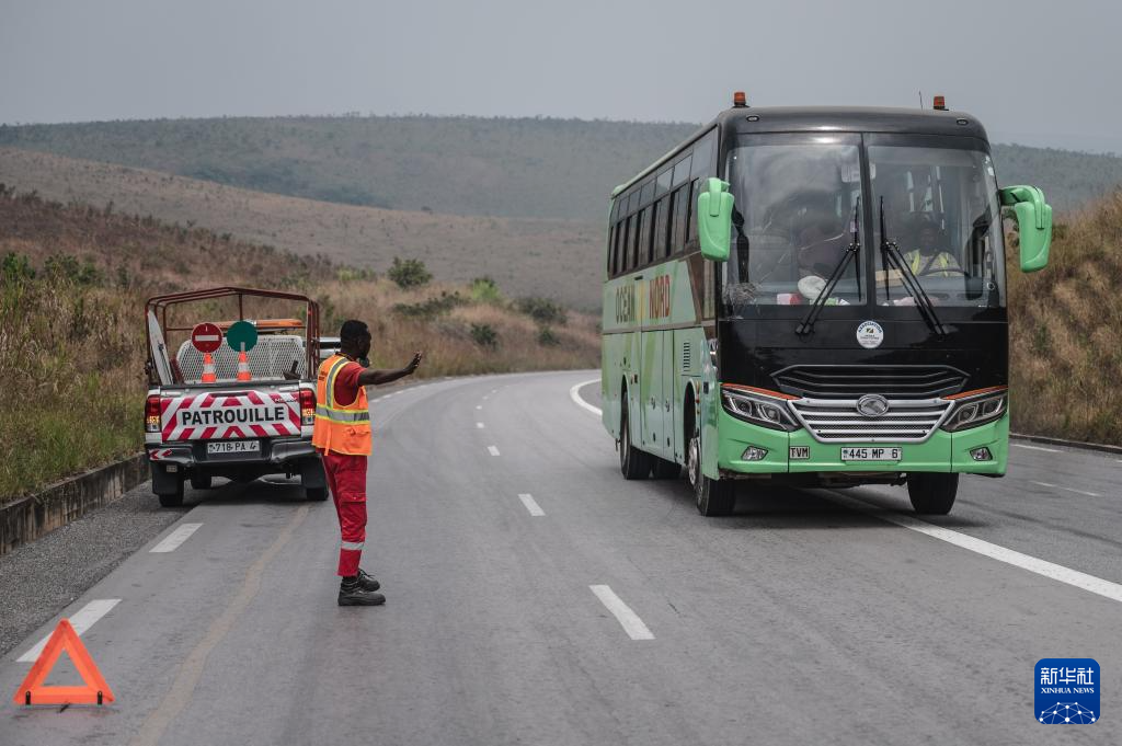 7月31日,在刚果(布)国家一号公路,公路巡逻队员指挥交通。