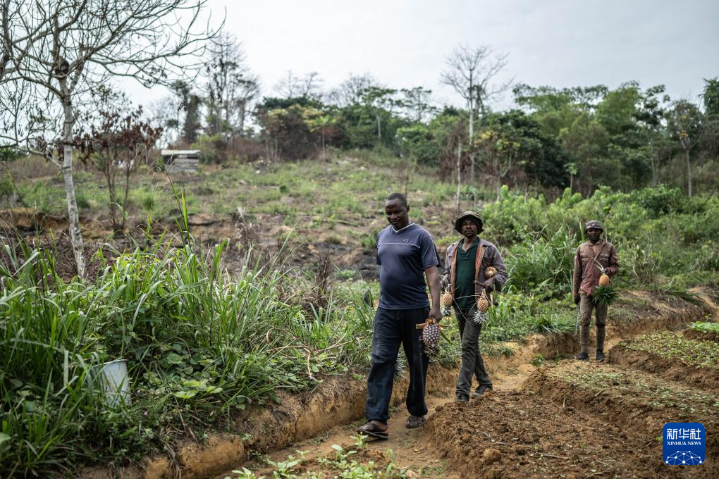 8月1日,农民阿兰(左)在刚果(布)国家一号公路沿线的菠萝地内采摘菠萝。