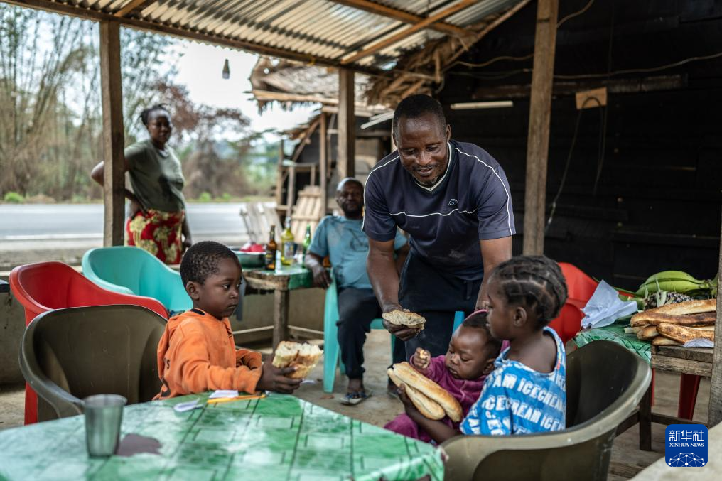 8月1日,农民阿兰将在市场购买的面包分享给位于刚果(布)国家一号公路沿线村庄的儿童。