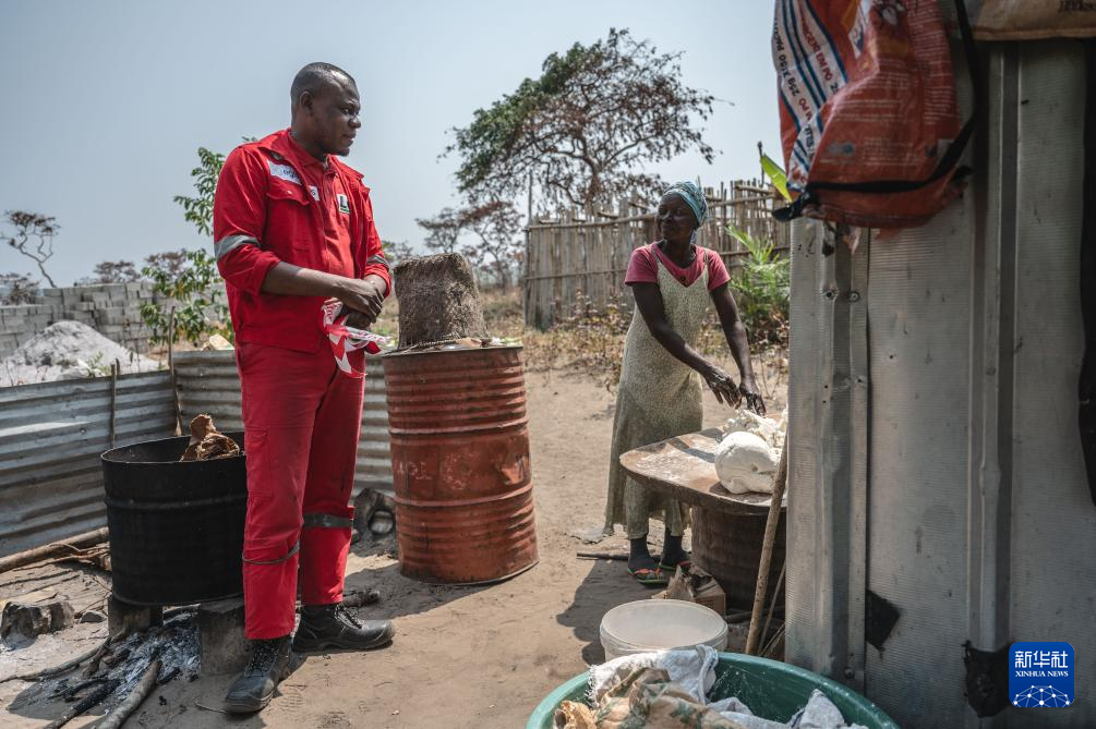7月31日,在刚果(布)国家一号公路沿线村落,公路巡逻队员安贡巴与村民交流道路使用情况。