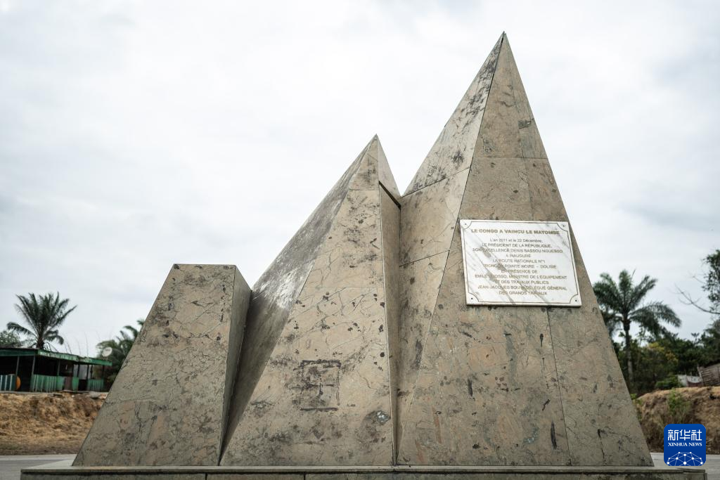 这是8月1日在刚果(布)第三大城市多利拍摄的“劈山者”雕像。