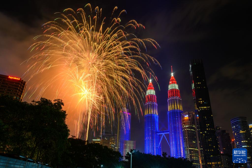 这是8月31日在吉隆坡的马来西亚国家石油公司双塔附近拍摄的焰火表演。