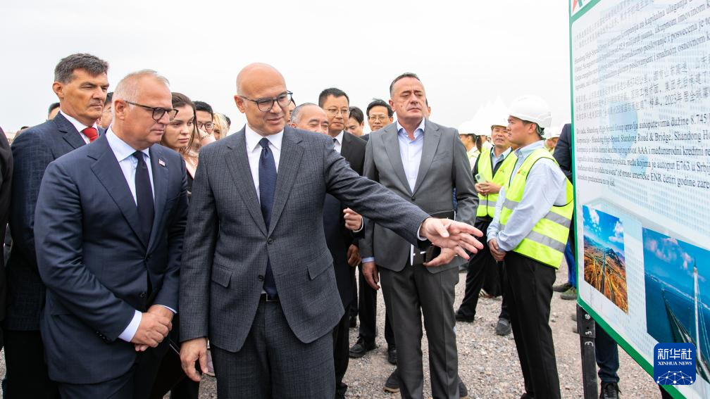 9月9日,在塞尔维亚首都贝尔格莱德,塞尔维亚总理武切维奇(前右)与塞尔维亚建设、交通和基础设施部部长戈兰·韦西奇(前左)观看项目介绍展板。