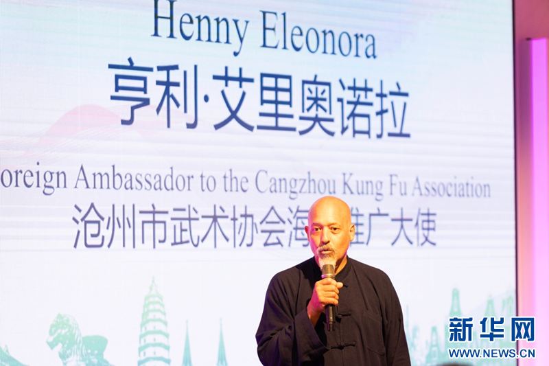 中国河北省沧州市武术协会海外推广大使亨利·艾里奥诺拉在活动上分享他和沧州武术的故事。(沧州市国际传播中心欧洲分中心供图)