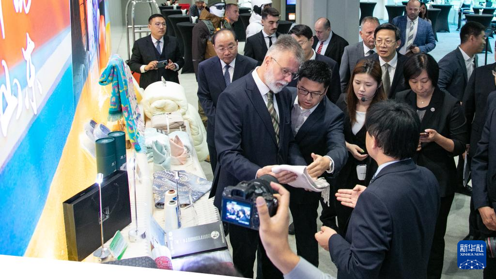9月10日,在塞尔维亚首都贝尔格莱德,塞尔维亚信息和电信部长里斯蒂奇在中国(山东)-塞尔维亚经贸合作交流会上了解来自中国山东省企业的产品。新华社发(王韡摄)