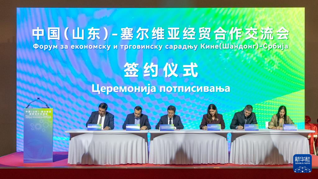 9月10日,在塞尔维亚首都贝尔格莱德,中塞两国企业在中国(山东)-塞尔维亚经贸合作交流会上签署合作协议。新华社发(王韡摄)