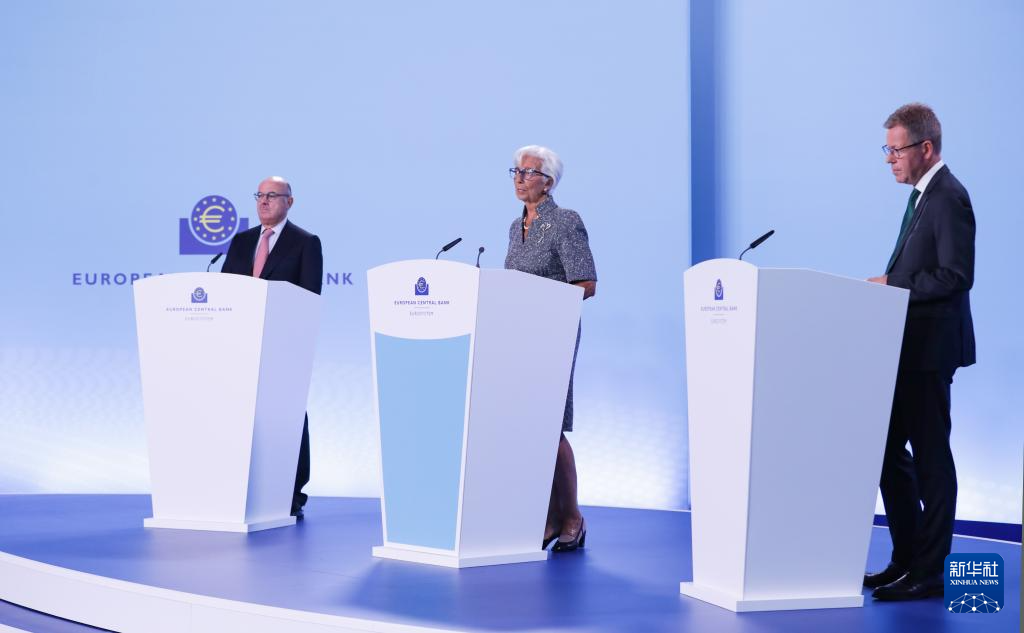 9月12日,欧洲中央银行行长拉加德(中)在德国法兰克福欧洲中央银行总部举行的新闻发布会上讲话。
