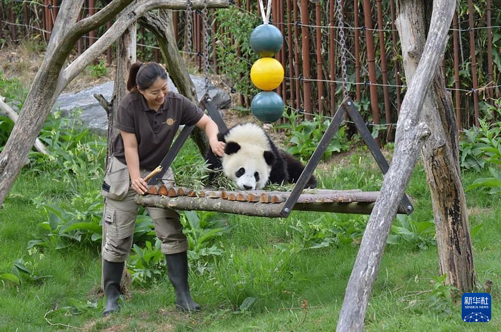 9月9日,在位于比利时布吕热莱特的天堂动物园,刘洋给大熊猫喂食。