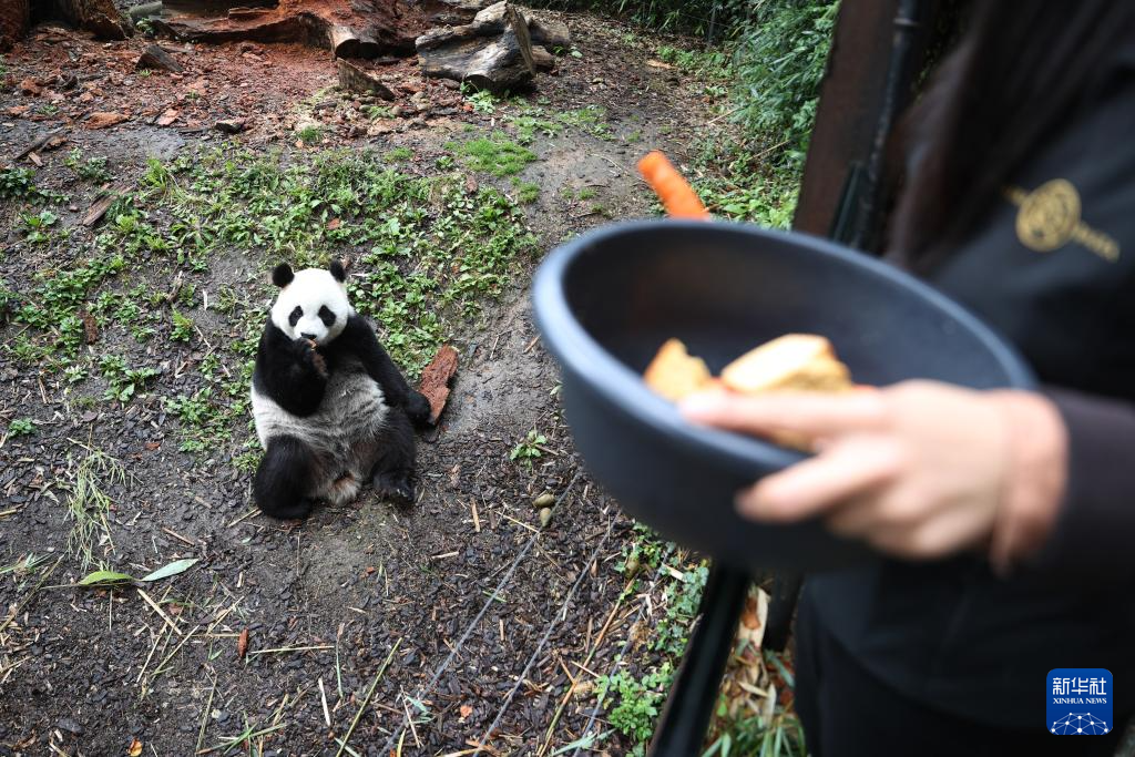 9月9日,在位于比利时布吕热莱特的天堂动物园,刘洋给大熊猫“宝妹”喂食。