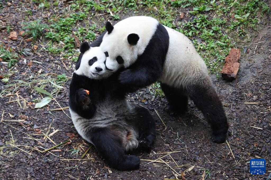 9月10日,在位于比利时布吕热莱特的天堂动物园,大熊猫“宝弟”(右)和“宝妹”在玩耍。