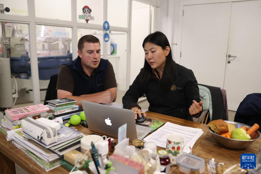 9月10日,在位于比利时布吕热莱特的天堂动物园,刘洋(右)和外方同事罗宾讨论大熊猫饲养工作细节。