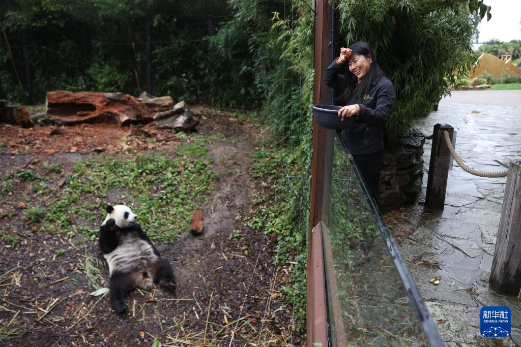 9月10日,在位于比利时布吕热莱特的天堂动物园,刘洋与大熊猫“星辉”互动。