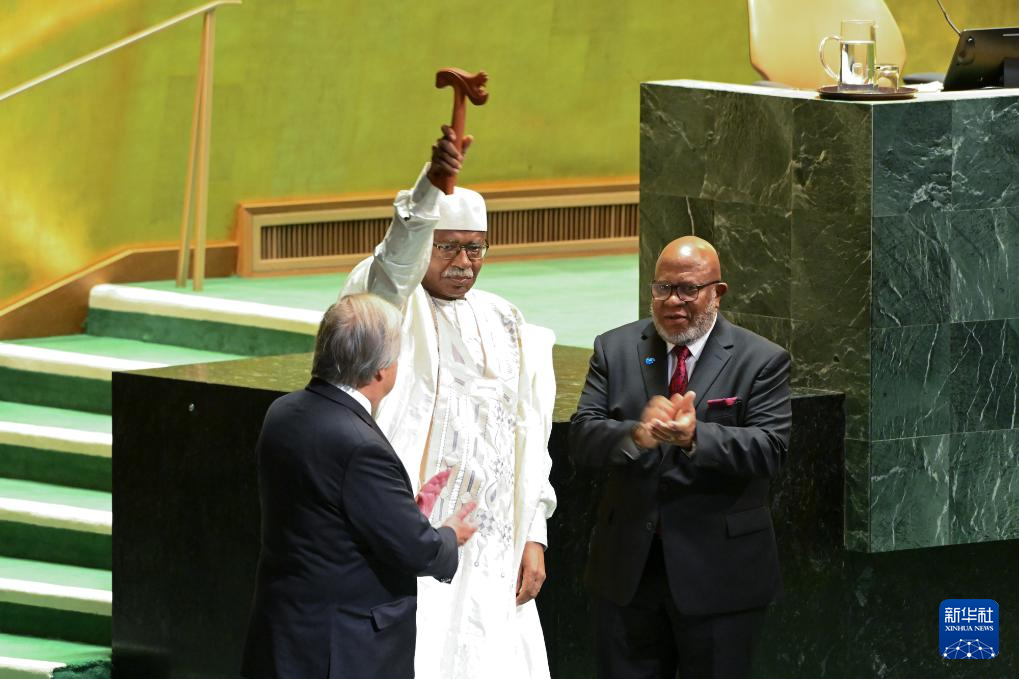 9月10日,在位于纽约的联合国总部,第79届联大主席菲勒蒙·扬(中)从第78届联大主席弗朗西斯(右)手里接过主席木槌。第78届联合国大会当日上午闭幕。