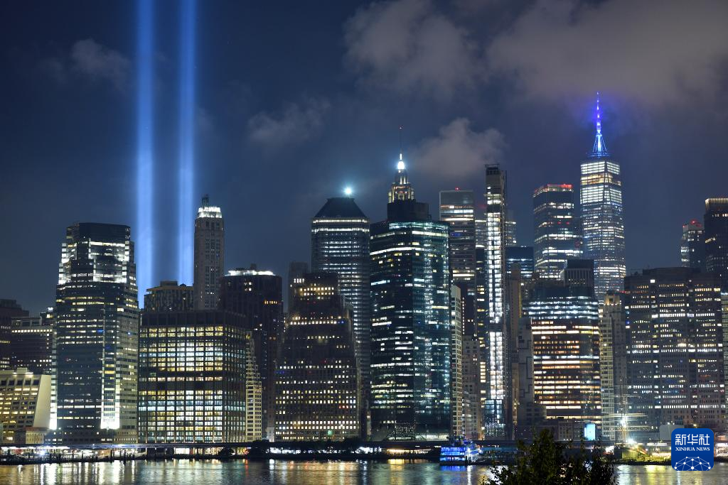 9月11日晚,美国纽约世贸中心遗址附近亮起象征纽约世贸中心“双子塔”大厦的光柱,纪念“9·11”恐怖袭击事件二十三周年。