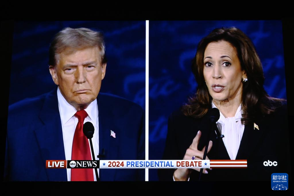 这张9月10日在美国费城总统辩论媒体中心拍摄的视频直播画面显示,美国副总统、民主党总统候选人哈里斯(右)和美国前总统、共和党总统候选人特朗普在费城参加电视辩论。