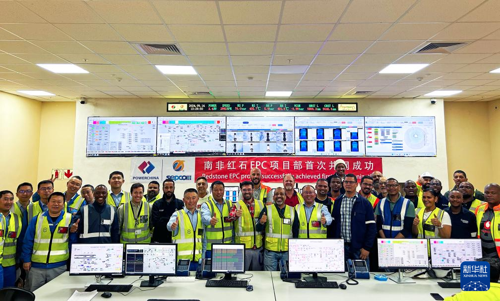 9月14日,在南非北开普省,两国工作人员共同庆祝南非红石100兆瓦塔式熔盐光热电站项目顺利实现并网发电。