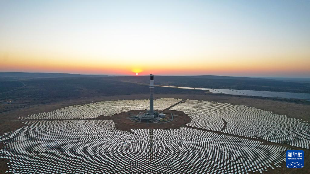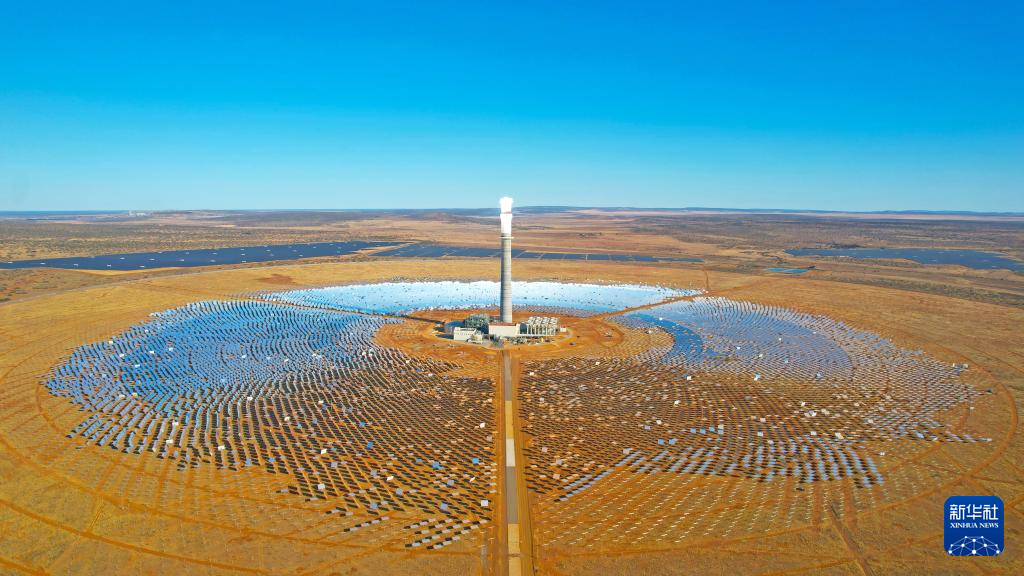 这是9月5日在南非北开普省拍摄的南非红石100兆瓦塔式熔盐光热电站项目(无人机照片)。