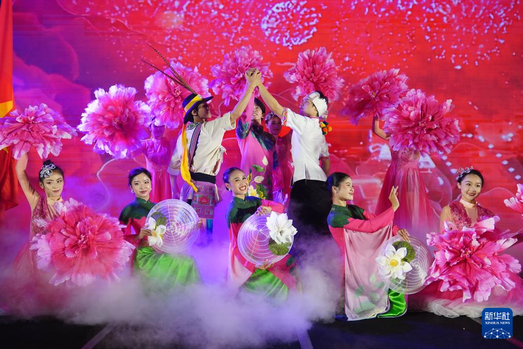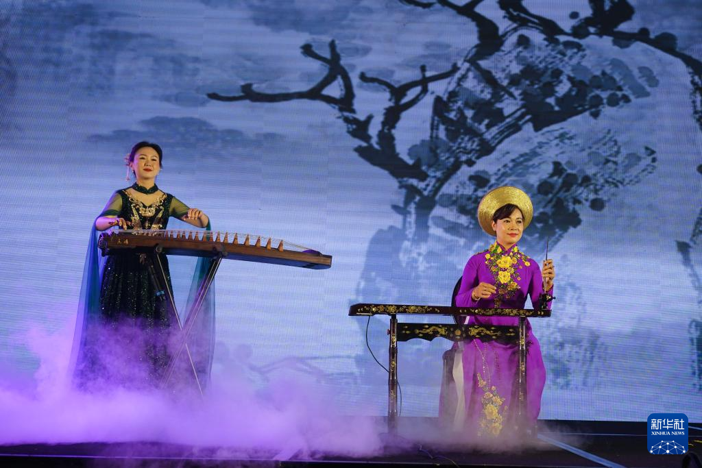 庆祝中华人民共和国成立75周年招待会暨“花好月圆”中越跨国中秋晚会16日晚在越南胡志明市举办,中越两国艺术家和表演团体同台献艺,共唱中越友谊之歌,共跳花好月圆之舞。