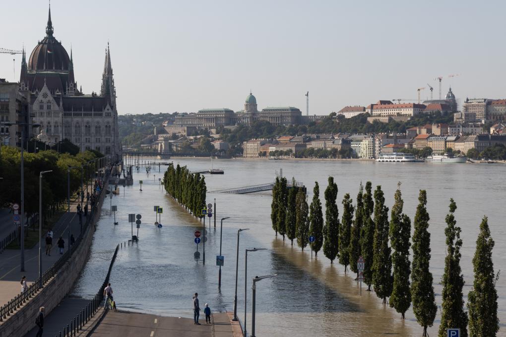 9月19日,在匈牙利首都布达佩斯,人们查看水位上涨的多瑙河。