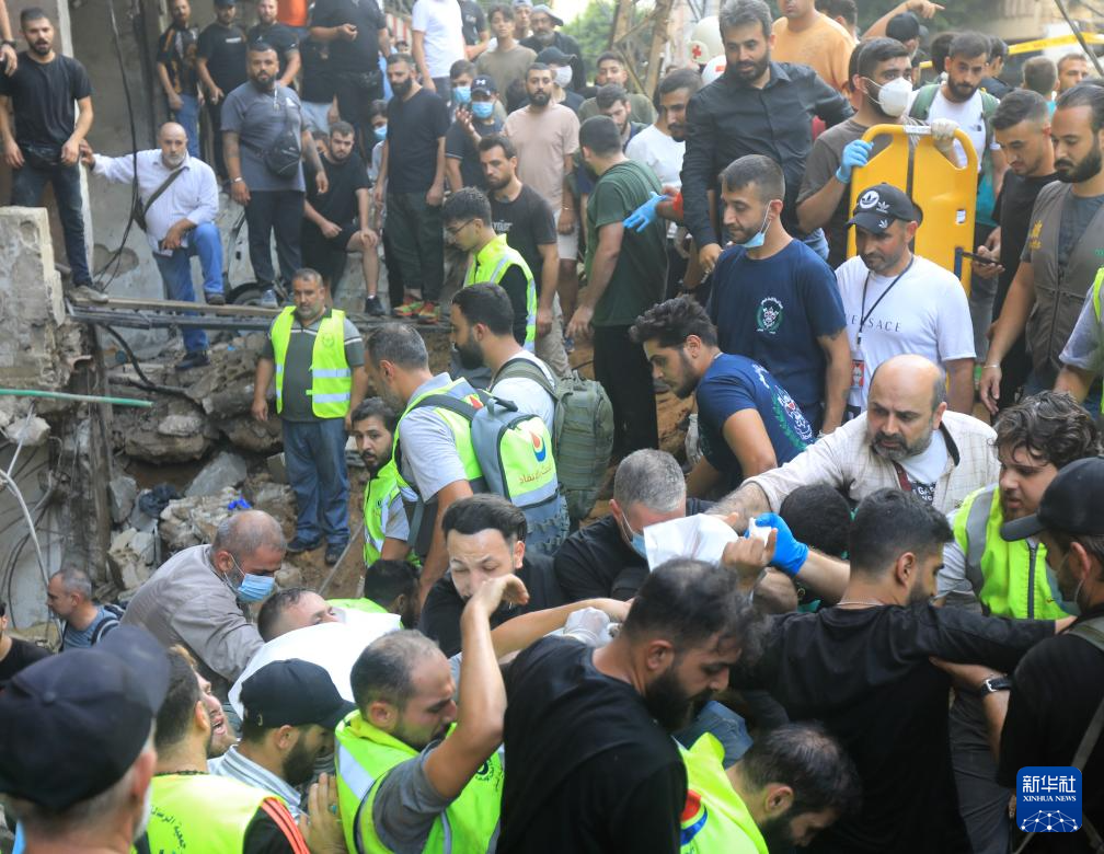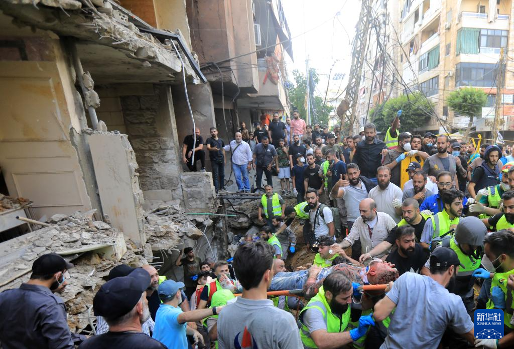 9月20日,救援人员在黎巴嫩贝鲁特南郊遭空袭现场转移伤者。