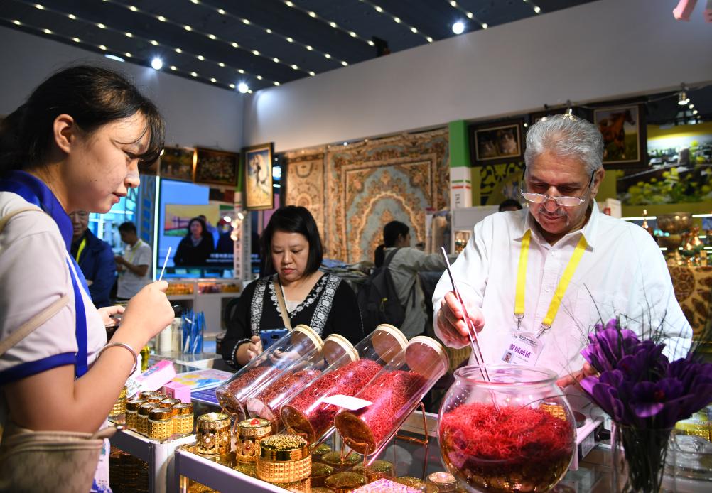 9月20日,来自伊朗的参展商(右一)向观众介绍产品。新华社记者 张博文 摄