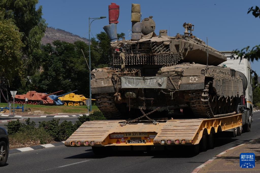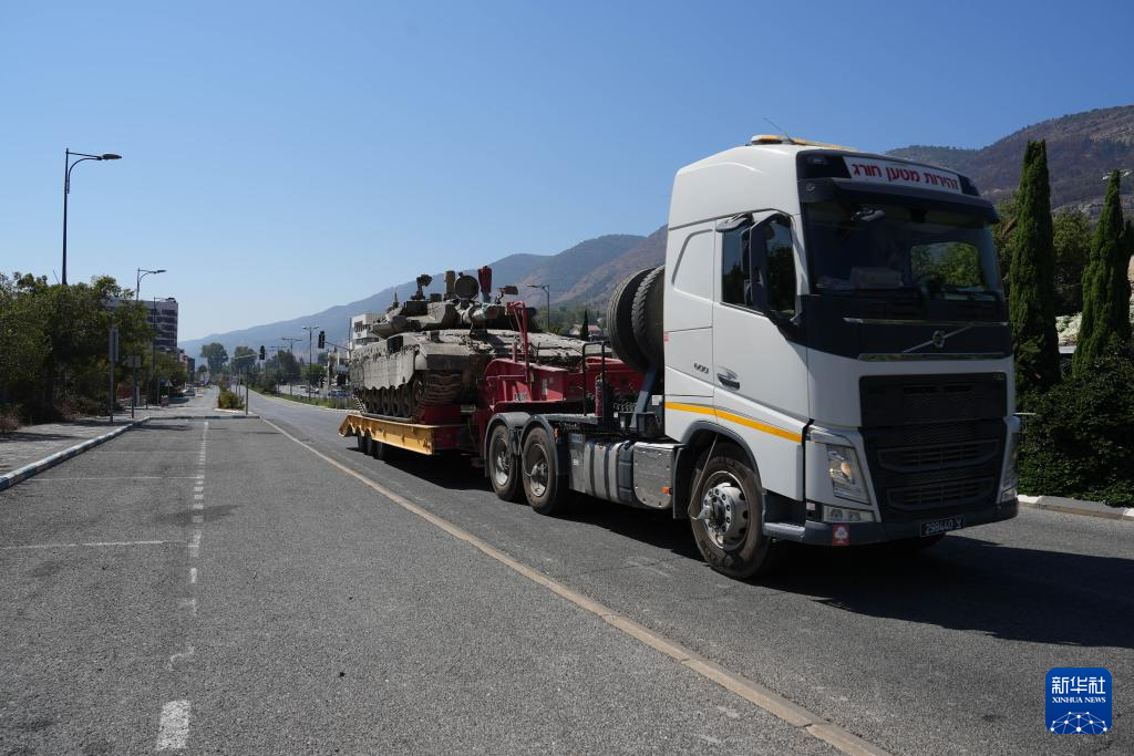 这是9月26日在以色列北部谢莫纳镇拍摄的运输中的以军坦克。真主党和以色列之间的冲突近日持续升级,引发外界对于冲突失控走向全面战争的担忧。