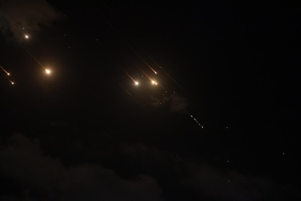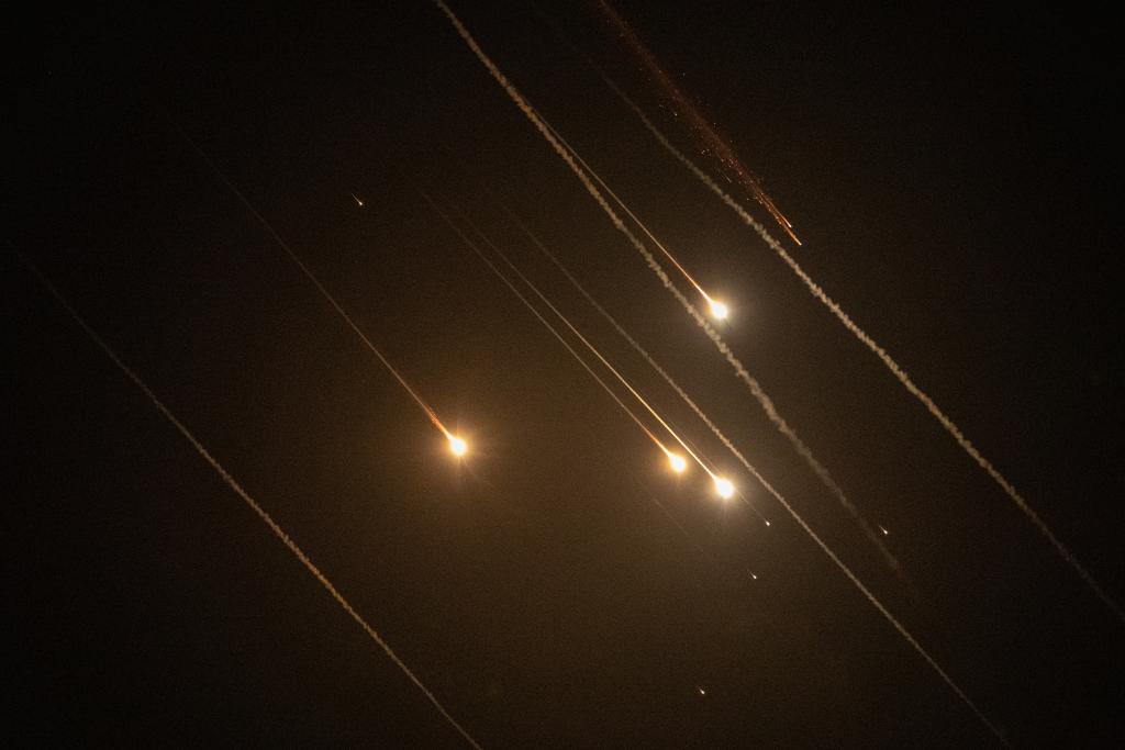 10月1日,以军防空系统拦截的发射物从耶路撒冷上空飞过。新华社发(贾马尔·阿瓦德摄)