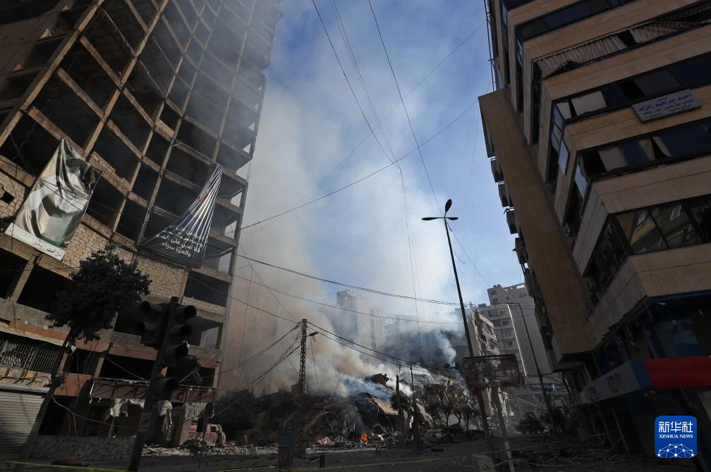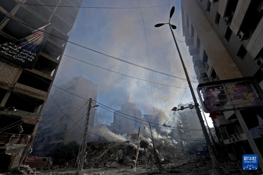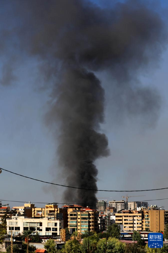 10月3日,黎巴嫩首都贝鲁特遭空袭地点升起浓烟。