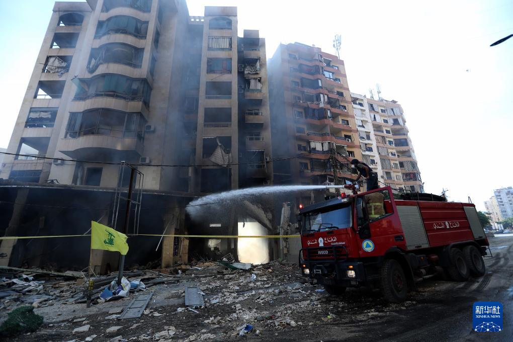 10月3日,在黎巴嫩首都贝鲁特,消防员在空袭现场灭火。
