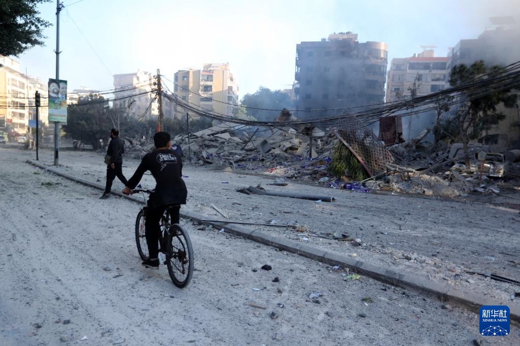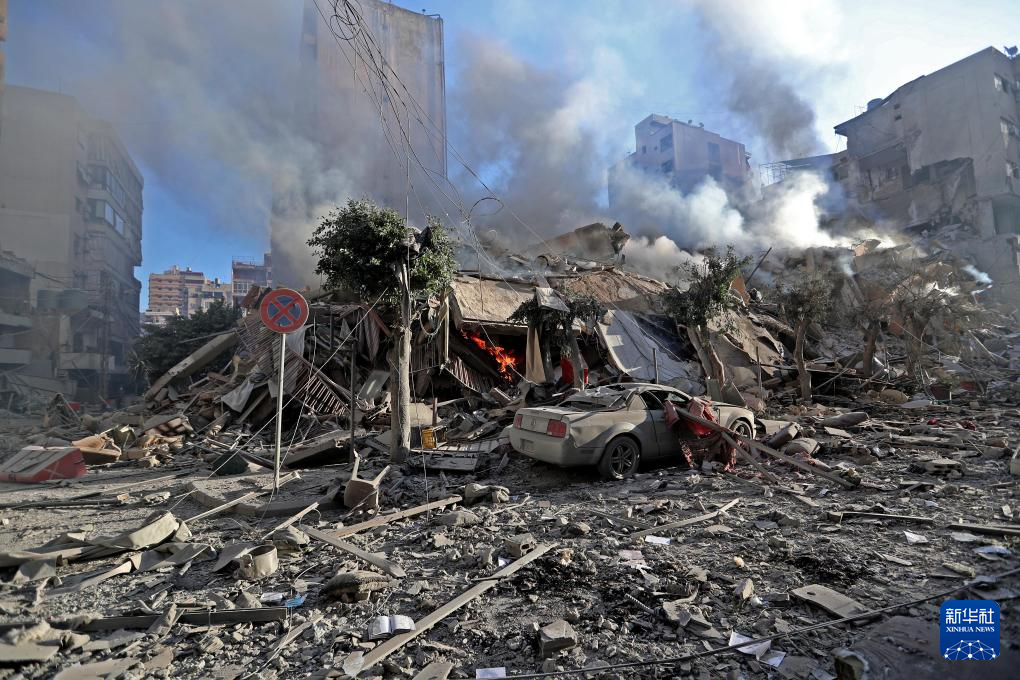 10月3日,在黎巴嫩首都贝鲁特,以军空袭过后街道上一片狼藉。