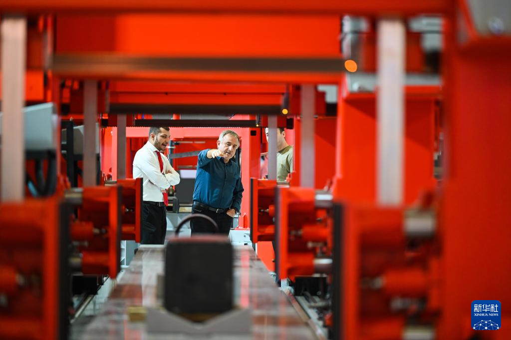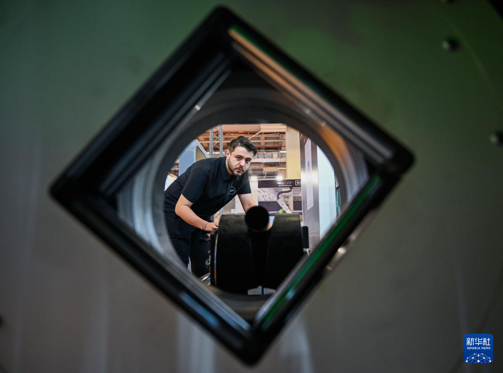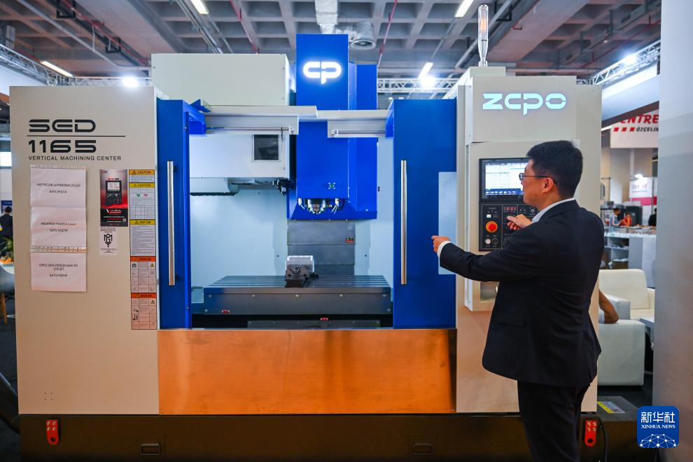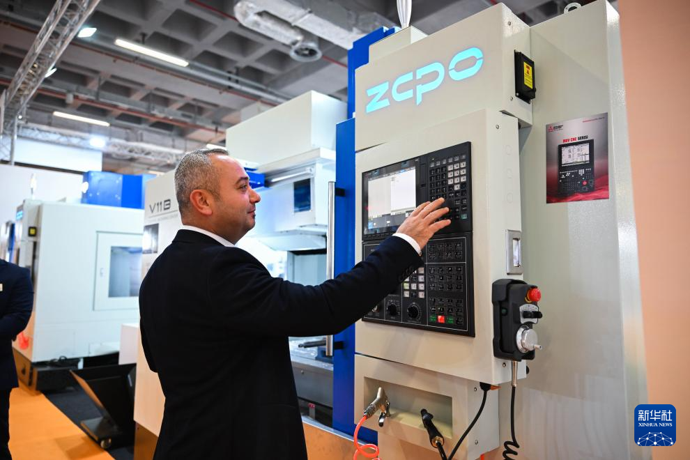 10月5日,在土耳其伊斯坦布尔举行的第八届土耳其欧亚机床展览会上,一名安徽卓朴智能装备股份有限公司展台的工作人员进行操作演示。