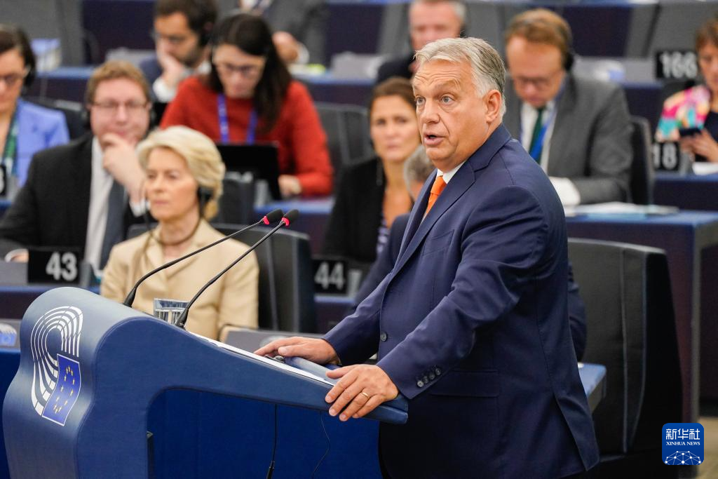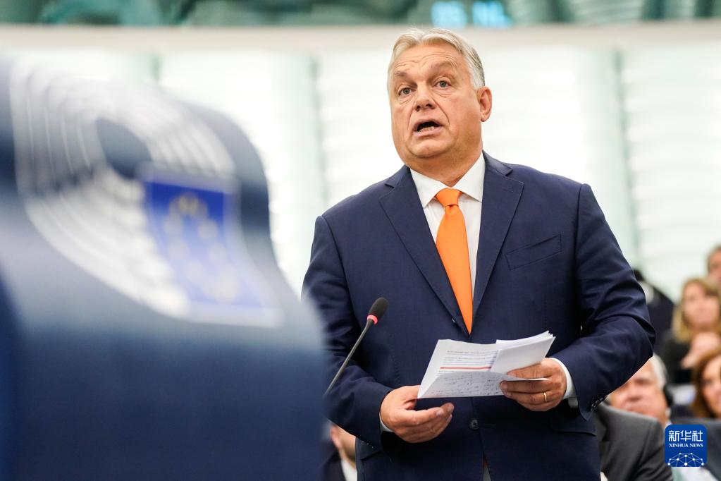 10月9日,匈牙利总理欧尔班(中)在总部设在法国斯特拉斯堡的欧洲议会发表讲话。