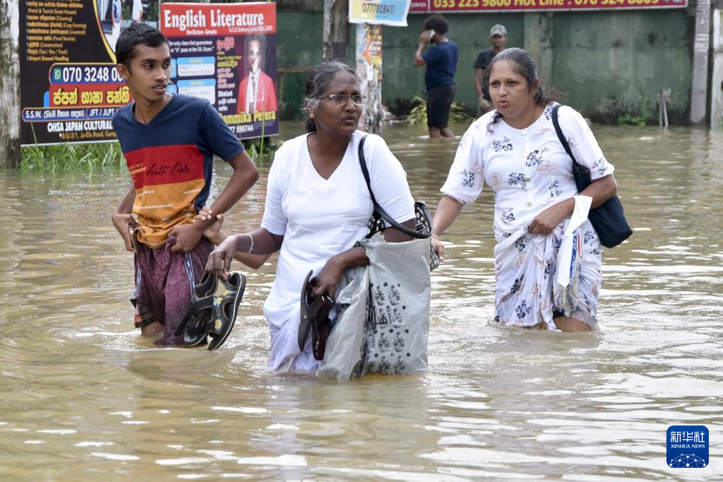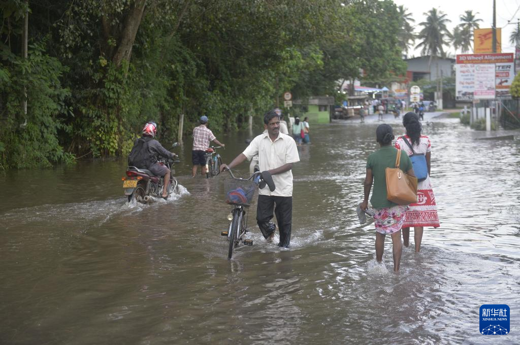 10月12日,在斯里兰卡加姆珀哈,人们经过被淹没的街道。