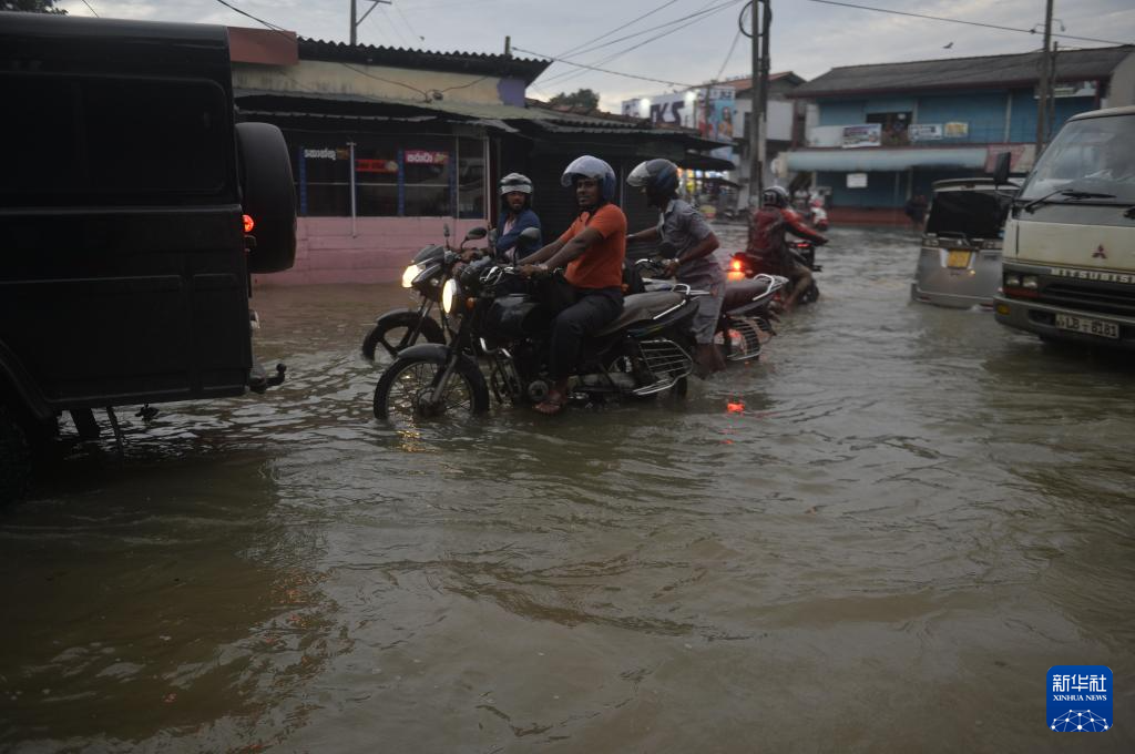 10月12日,在斯里兰卡米努万戈德,人们骑摩托车经过被淹没的街道。