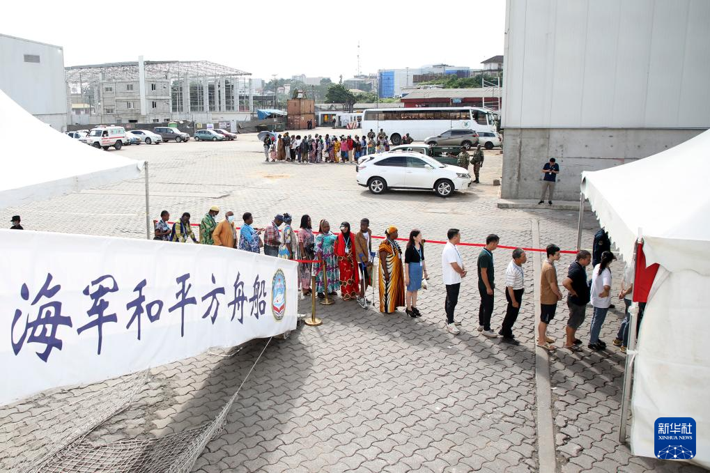 10月10日,中国海军“和平方舟”号医院船在喀麦隆开展活动,当地民众排队就诊。