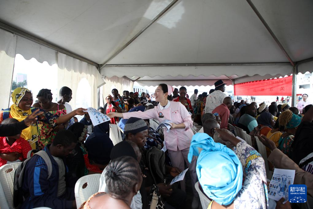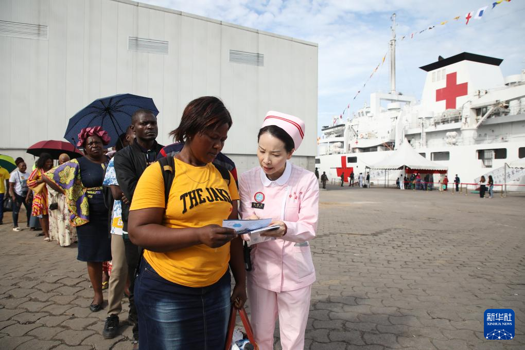 10月10日,中国海军“和平方舟”号医院船在喀麦隆开展活动,医务人员发放宣传手册。