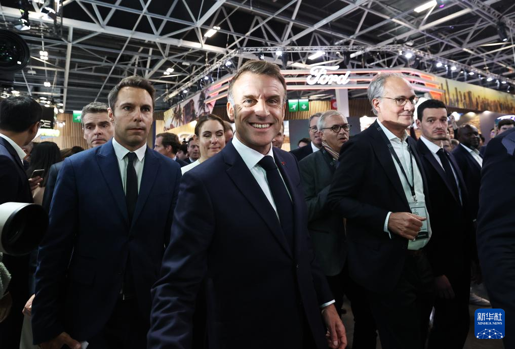 10月14日,法国总统马克龙在法国巴黎凡尔赛门展览中心举行的2024巴黎车展媒体开放日上参观。
