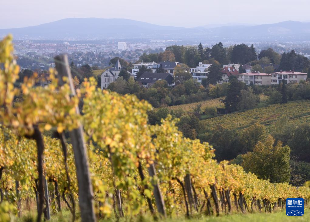 这是10月15日在奥地利维也纳市郊的卡伦山上拍摄的葡萄园和维也纳城区。