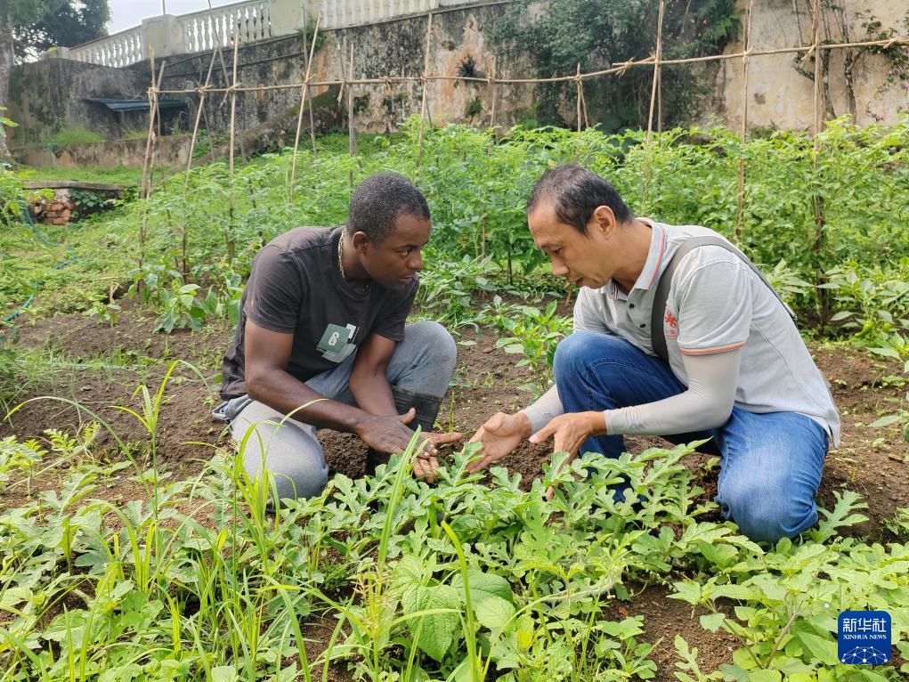 中国援圣普农牧业技术项目组专家彭杰(右)在圣多美和普林西比的梅佐希大区指导蔬菜种植户改善田间管理技术(2024年1月25日摄)。