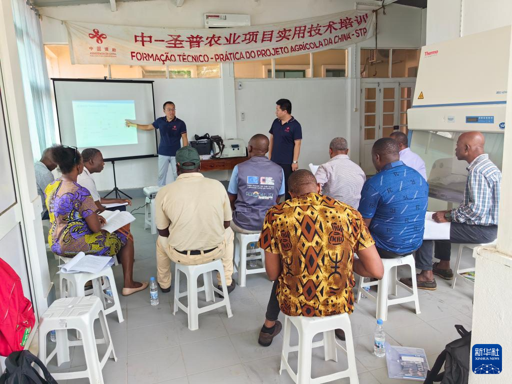 中国援圣普农牧业技术项目组专家段振华(后左)在圣多美和普林西比的国家兽医实验室开展动物疫病监测技术培训(2024年6月21日摄)。