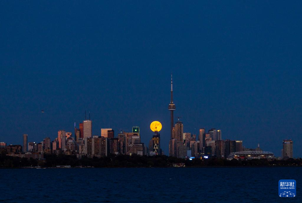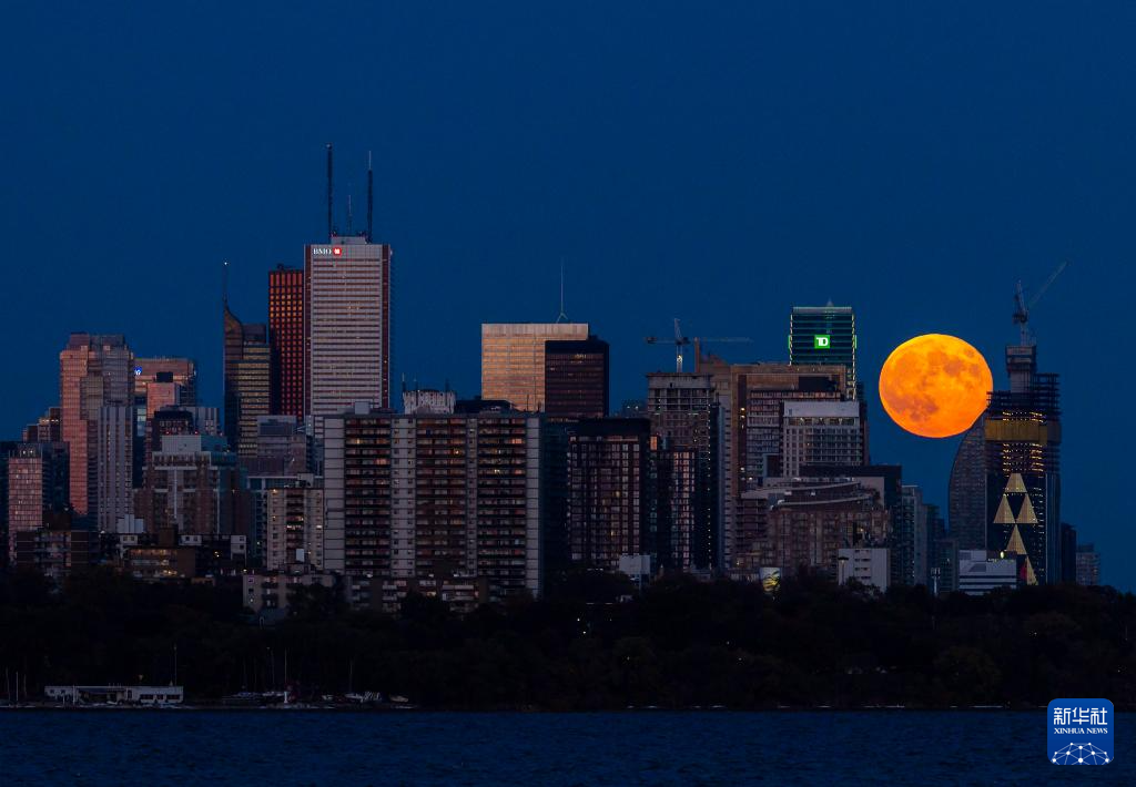 10月17日,一轮满月从加拿大多伦多的天际线上升起。