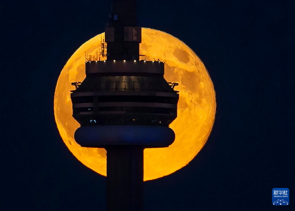 满月现身多伦多夜空-这是10月17日在加拿大多伦多拍摄的一轮满月与加拿大国家电视塔。'...