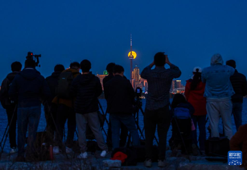 10月17日,人们在加拿大多伦多拍摄一轮满月从城市天际线上升起。
