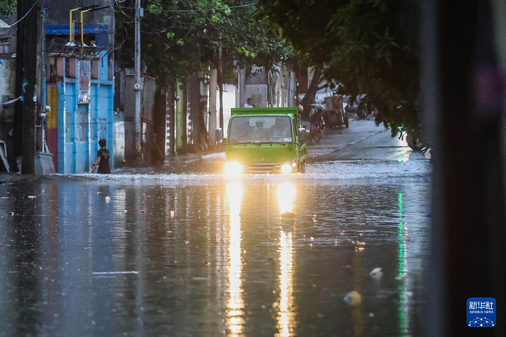 10月24日,在菲律宾奎松市,一辆卡车行驶在积水的街道上。