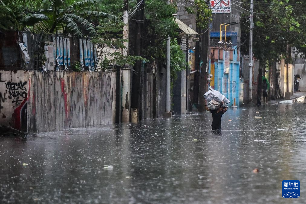 10月24日,在菲律宾奎松市,当地人扛着袋子涉水前行。