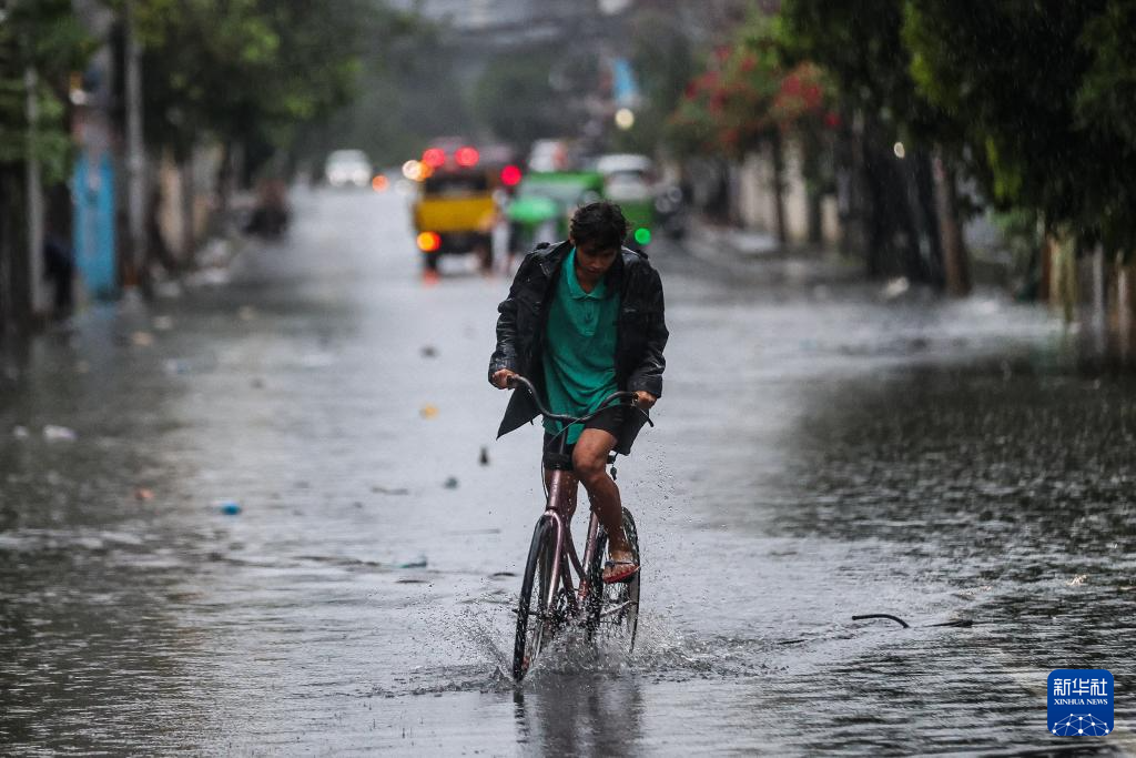 10月24日,一名男子在菲律宾奎松市积水的街道上骑行。