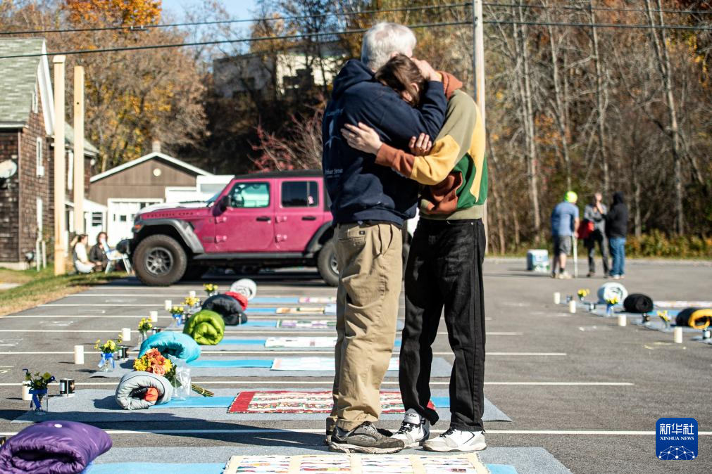 10月25日,人们在美国缅因州刘易斯顿市悼念枪击案遇难者时相互拥抱。