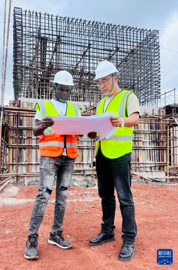 8月28日,在科特迪瓦本贾利省的电池储能项目建筑工地,项目翻译科拉尼·捷尼比亚(左)与同事查看施工图纸。