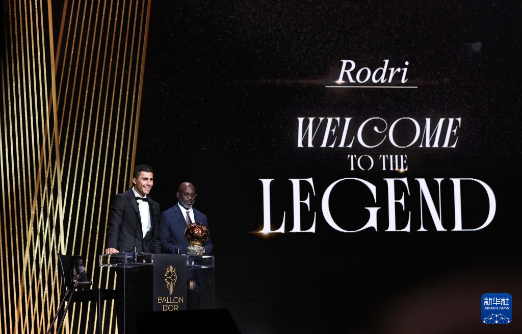 10月28日,男子金球奖获得者罗德里(左)发表获奖感言。
